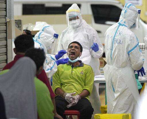 A health worker collects sample for coronavirus testing from a worker at a locked down wet market as one of its traders tested positive for COVID-19 in Petaling Jaya, Malaysia, Tuesday, April 28, 2020. The Malaysian government issued a restricted movement order to the public till April 28, to help curb the spread of the new coronavirus. (AP Photo/Vincent Thian) The Associated Press