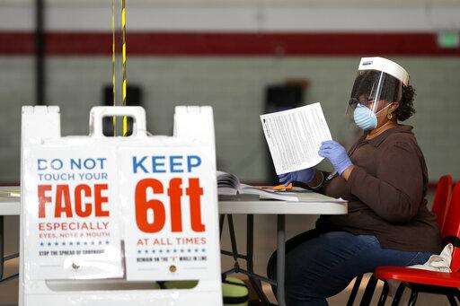 Louisa Boyer, a provisional election judge, reviews paperwork at a voting center at Edmondson High School as voters arrive to cast their ballot in the 7th Congressional District special election, Tuesday, April 28, 2020, in Baltimore. The election to fill a seat left open by the death last October of Congressman Elijah Cummings has been dramatically reshaped by the coronavirus outbreak. (AP Photo/Julio Cortez) The Associated Press