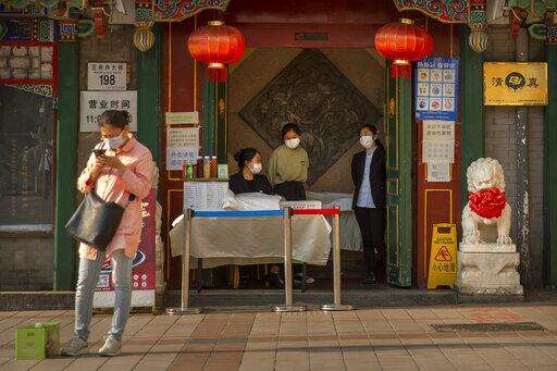 Clerks wear face masks to prevent the spread of the new coronavirus as they wait for customers at the entrance to a restaurant in Beijing, Tuesday, April 28, 2020. The Chinese city of Wuhan, which was the original epicenter of the pandemic, again reported no new coronavirus cases or deaths Tuesday and its hospitals remained empty of virus patients for a second straight day. (AP Photo/Mark Schiefelbein) The Associated Press