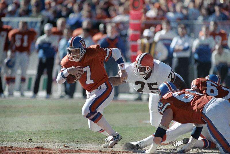 Denver Broncos quarterback John Elway scrambles to safety during the 1990 AFC Championship. Lineman Jim Juriga (66) gets up after blocking his man to rejoin the play. Associated Press
