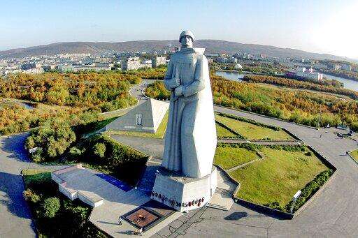 In this photo taken on Friday, Sept. 19, 2014, the Monument to Defenders of the Soviet Arctic during the Great Patriotic War, commonly called Alyosha, is seen in Murmansk, Russia. The 35-meter (116-foot) soldier who gazes from a hilltop across the city and out to the frigid bay is hard to miss. He's such a familiar figure that locals have taken treating him as neighbor, calling him Alyosha, a friendly diminutive of Alexei. (AP Photo/Lev Fedoseyev)