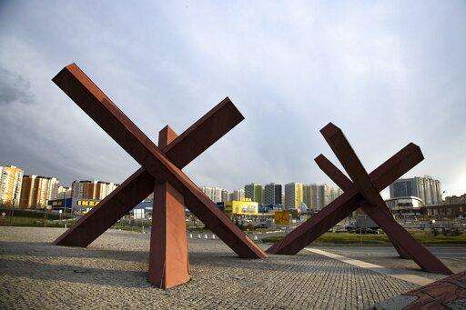 In this photo taken on Thursday, April 30, 2020, a World War II monument featuring giant anti-tank traps is seen on the outskirts of Moscow, Russia. One Moscow memorial often perplexes first-time visitors to the capital: the steel beams resembling giant children's jacks set in the middle of the highway leading from Sheremetyevo Airport. They represent tank traps and mark the approximate point of the closest advance of Nazi forces on the capital. (AP Photo/Alexander Zemlianichenko)