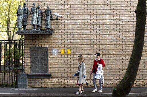 In this photo taken on Tuesday, May 5, 2020, The Monument to the Heroes ' Schoolchildren dedicated to schoolchildren who died during World War II, is seen in Moscow, Russia. One of Moscow's memorials can easily be passed by if someone isn't looking for it. On a building on a sidestreet, a plinth placed well above pedestrians' heads holds figures of schoolboys who quit their studies to join the fight and then lost their lives. The monument consisted of five bronze figures of dead volunteers-tenth-graders standing on a pedestal from left; Yury Divilkovsky, Igor Kuptsov, Igor Bogushevsky, Grigory Rodin and Gabor Raab. (AP Photo/Alexander Zemlianichenko)