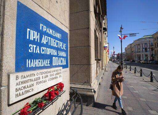 In this photo taken on Friday, May 1, 2020, the stencil plate reading "Citizens! During artillery fire, this side of the street is more perilous", which has been on this site since the World War II, is seen in far down Nevsky Prospekt, the city's main avenue, in St. Petersburg, Russia. A far smaller sign reminds passersby of some of the suffering that earned the title. Such signs were common during the siege and this one is renewed with fresh paint every few years. (AP Photo/Dmitri Lovetsky)