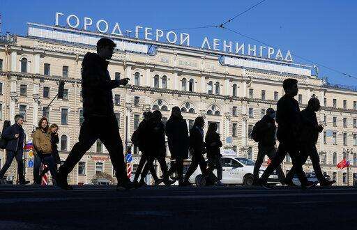 In this Friday, May 1, 2020 photo, a sign reads "Hero City Leningrad" installed atop the Oktyabrskaya Hotel across from the Moskovsky railway station in St.Petersburg, Russia. When passengers exit the city's main railway station, they face a huge sign sprawled across a building on the other side of the square: "Hero City Leningrad," a title bestowed on the city for its endurance of the 1941-44 siege. (AP Photo/Dmitri Lovetsky)
