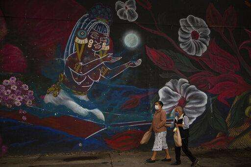 Women wearing face masks amid the spread of the new coronavirus walk outside the closed Jamaica flower market in Mexico City, Thursday, May 7, 2020. While some flower vendors with shops still open outside the market, the large wholesale flower market temporarily closed for one week starting Thursday, ahead of Mother's Day in an effort by the city to keep the usual holiday crowds away. (AP Photo/Fernando Llano)