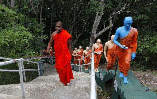 A Sri Lankan Buddhist monk climbs the steps past statues at a deserted temple during curfew on Buddha Jayanthi, a day that celebrates the birth of the Buddha, in Colombo, Sri Lanka, Thursday, May 7, 2020. Sri Lanka has again reimposed a 24-hour countrywide curfew until next Monday, as part of stringent measures to contain the spread of the coronavirus. (AP Photo/Eranga Jayawardena)