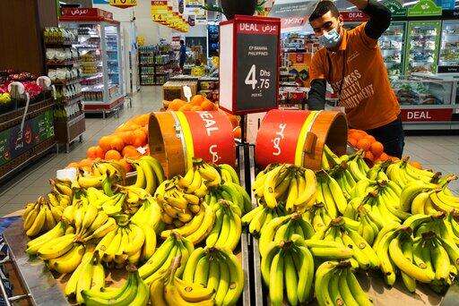 In this April 19, 2020 photo, a worker organizes bananas at a Carrefour supermarket while wearing a face mask amid the coronavirus pandemic, in Dubai, United Arab Emirates. The coronavirus pandemic has exposed just how vital foreigners are to the Gulf Arab countries where they work as medics, drivers, grocers and cleaners. (AP Photo/Jon Gambrell)
