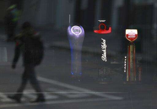 Beer taps of South African Brewery brands are seen through the window of a bar as a passing man's reflection is caught in the window in Cape Town, South Africa, Thursday, May 7, 2020. South African Breweries, the second biggest brewer in the world, says it may have to destroy 400 million bottles of the beer because of the country's ban on alcohol sales during its lockdown to combat the spread of the coronavirus. (AP Photo/Nardus Engelbrecht)
