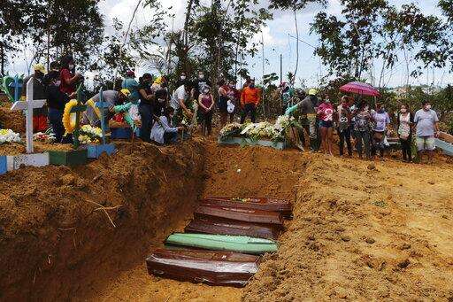 In this Tuesday, April 21, 2020 photo, relatives attend a mass burial at the Nossa Senhora Aparecida cemetery, in Manaus, Amazonas state, Brazil. The cemetery is carrying out burials in common graves due to the large number of deaths from COVID-19, according to a cemetery official. (AP Photo/Edmar Barros)