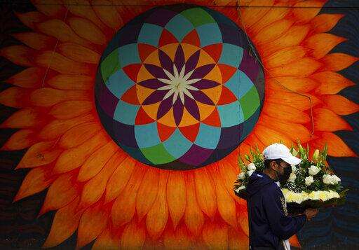 A flower vendor wearing a face mask amid the spread of coronavirus walks outside the closed Jamaica flower market in Mexico City, Thursday, May 7, 2020. While some flower vendors with shops still open outside the market, the large wholesale flower market temporarily closed for one week on Thursday ahead of Mother's Day, an effort by the city to keep the usual holiday crowds away. (AP Photo/Fernando Llano)