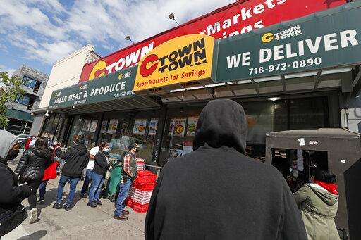 People line up outside a grocery store along the Fifth Avenue business district of the Sunset Park neighborhood in the Brooklyn borough of New York, Monday, May 11, 2020, during the coronavirus outbreak. Although Gov. Andrew Cuomo on Monday gave the green light to some areas to gradually begin to reopen once the latest stay-at-home order expires Friday, New York City is not one them. (AP Photo/Kathy Willens)