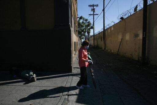 A woman with a mask and protective gloves walks past a homeless man napping on the street amid the coronavirus pandemic in the Westlake neighborhood of Los Angeles, Thursday, May 21, 2020. While most of California is welcoming a slight return toward normal this holiday weekend, Los Angeles will not be joining the party. The nation's largest county is not planning to reopen more widely until the next summer holiday, July 4th, because of a disproportionately large share of the state's coronavirus cases and deaths that have hampered the county's ability to rebound and meet strict criteria to get more people back to work.(AP Photo/Jae C. Hong)