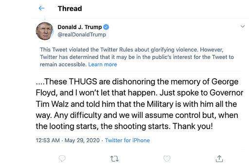"When the looting starts, the shooting starts,'ť Trump wrote in a tweet that was quickly flagged by Twitter as violating rules against 'œglorifying violence." The White House said the president 'œdid not glorify violence. He clearly condemned it.'ť