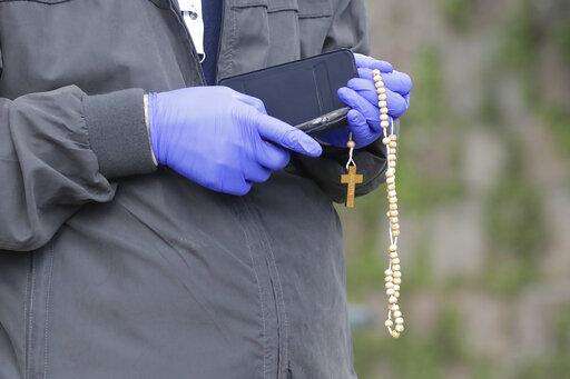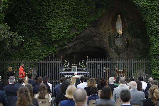 A priest wears face mask to prevent the spread of COVID-19, as Pope Francis prays during a rosary in Vatican gardens Saturday, May 30, 2020. In background is a reconstruction of the Lourdes' grotto in southern France, where the Virgin Mary is alleged to have appeared eighteen times to Bernadette Soubirous in 1858. Pope Francis is reciting a special prayer for the end of the coronavirus pandemic surrounded by a representative sampling of people on the front lines in his biggest post-lockdown gathering to date. (AP Photo/Alessandra Tarantino, pool)