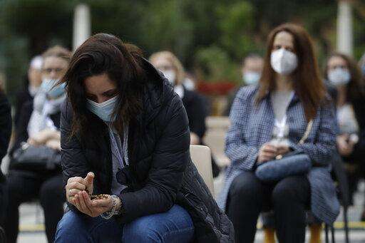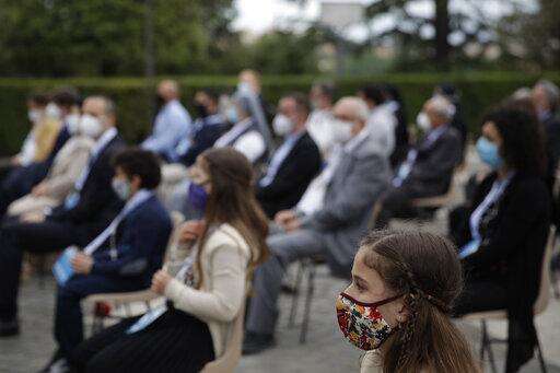 Faithful wearing face mask to prevent the spread of COVID-19 pray during a rosary lead by Pope Francis in Vatican gardens Saturday, May 30, 2020. Pope Francis is reciting a special prayer for the end of the coronavirus pandemic surrounded by a representative sampling of people on the front lines in his biggest post-lockdown gathering to date. (AP Photo/Alessandra Tarantino, pool)