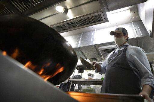 Volunteer of COVID Thailand Aid, Chef Chalee Kader from Thailand cooks "pad krapow gai", the spicy minced chicken for the railway-side community at Bo.lan restaurant in Bangkok, Thailand Wednesday, June 10, 2020. Thailand's Natalie Bin Narkprasert, who runs a business in Paris, was stranded in her homeland by a flight ban, so she decided to use her skills to organize the network of volunteers, including Michelin-starred chefs, to help those in her homeland whose incomes were most affected by the pandemic restrictions. (AP Photo/Sakchai Lalit)