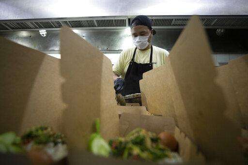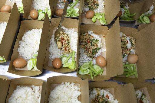 Volunteer of COVID Thailand Aid, chef Napol Jantraget from Thailand fills "pad krapow gai", the spicy minced chicken in a box for the railway-side community at Bo.lan restaurant in Bangkok, Thailand Wednesday, June 10, 2020. Thailand's Natalie Bin Narkprasert, who runs a business in Paris, was stranded in her homeland by a flight ban, so she decided to use her skills to organize  a network of volunteers, including Michelin-starred chefs, to help those in her homeland whose incomes were most affected by the pandemic restrictions. (AP Photo/Sakchai Lalit)