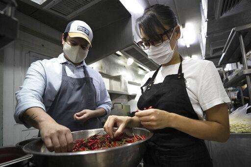 Volunteers of COVID Thailand Aid, Chef Chalee Kader, left, from Thailand, and Chef Saki Hoshino from Japan prepare chili for "pad krapow gai", the spicy minced chicken for the railway-side community at Bo.lan restaurant in Bangkok, Thailand, Wednesday, June 10, 2020. Thailand's Natalie Bin Narkprasert, who runs a business in Paris, was stranded in her homeland by a flight ban, so she decided to use her skills to organize the network of volunteers, including Michelin-starred chefs, to help those in her homeland whose incomes were most affected by the pandemic restrictions. (AP Photo/Sakchai Lalit)
