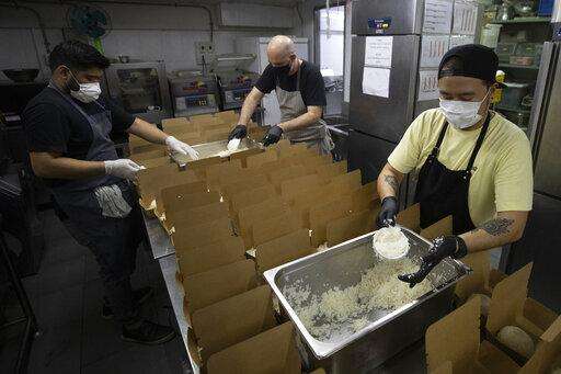 Volunteers of COVID Thailand Aid, chef Lorin Janita from the U.S., left, chef Tim Butler of the U.S., center and chef Napol Jantraget from Thailand, right, prepare meal for the railway-side community at Bo.lan restaurant in Bangkok, Thailand Wednesday, June 10, 2020. Thailand's Natalie Bin Narkprasert, who runs a business in Paris, was stranded in her homeland by a flight ban, so she decided to use her skills to organize the network of volunteers, including Michelin-starred chefs, to help those in her homeland whose incomes were most affected by the pandemic restrictions. (AP Photo/Sakchai Lalit)