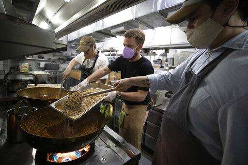 Volunteers of COVID Thailand Aid, chef Dylan Jones from Australia, left, restaurateur Jarrett Wrisley from the U.S., center, and chef Chalee Kader from Thailand cook "pad krapow gai", the spicy minced chicken for the railway-side community at Bo.lan restaurant in Bangkok, Thailand Wednesday, June 10, 2020. Thailand's Natalie Bin Narkprasert, who runs a business in Paris, was stranded in her homeland by a flight ban, so she decided to use her skills to organize  a network of volunteers, including Michelin-starred chefs, to help those in her homeland whose incomes were most affected by the pandemic restrictions. (AP Photo/Sakchai Lalit)