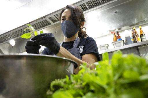 Project leader for food donations of COVID Thailand Aid, Megan Leon from Mexican prepares ingredients cooking "pad krapow gai", the spicy minced chicken for the railway-side community at Bo.lan restaurant in Bangkok Wednesday, June 10, 2020, Thailand. Thailand's Natalie Bin Narkprasert, who runs a business in Paris, was stranded in her homeland by a flight ban, so she decided to use her skills to organize  a network of volunteers, including Michelin-starred chefs, to help those in her homeland whose incomes were most affected by the pandemic restrictions. (AP Photo/Sakchai Lalit)