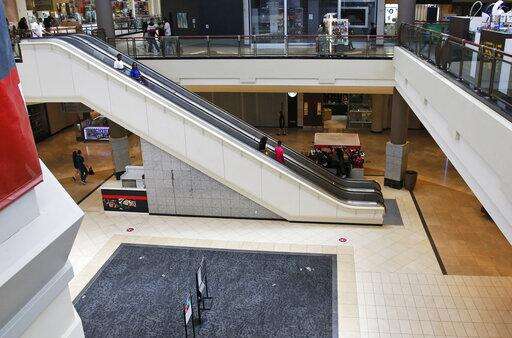 FILE - In this May 1, 2020, file photo, people ride down an escalator at a shopping mall in Oklahoma City as it reopens from its closure since mid-March due to coronavirus concerns. Many businesses are requiring customers and workers to sign forms saying they won't sue if they catch COVID-19. Businesses are afraid they could face lawsuits even if they follow social distancing and other government guidelines as they reopen across the U.S. after coronavirus shutdowns. (AP Photo/Sue Ogrocki, File) The Associated Press
