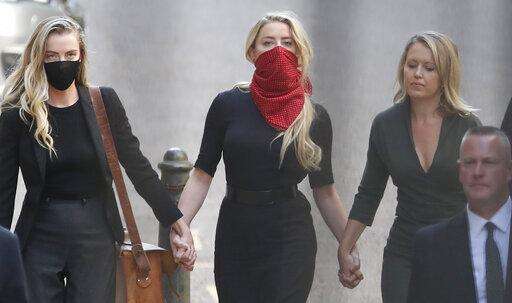 Actress Amber Heard, center, arrives at the High Court in London, Tuesday, July 7, 2020. Johnny Depp has a starring role in a real-life courtroom drama in London, where he is suing a tabloid newspaper for libel over an article that branded him a "wife beater." On Tuesday, a judge at the High Court is due to begin hearing Depp's claim against The Sun's publisher, News Group Newspapers, and its executive editor, Dan Wootton, over the 2018 story alleging he was violent and abusive to then-wife Amber Heard. Depp strongly denies the claim. (AP Photo/Alastair Grant) The Associated Press
