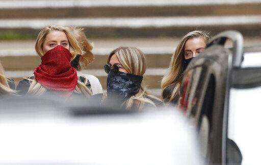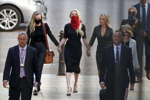 Actress Amber Heard, in red face mask at center, arrives at the High Court in London, Tuesday, July 7, 2020. Johnny Depp has a starring role in a real-life courtroom drama in London, where he is suing a tabloid newspaper for libel over an article that branded him a "wife beater." On Tuesday, a judge at the High Court is due to begin hearing Depp's claim against The Sun's publisher, News Group Newspapers, and its executive editor, Dan Wootton, over the 2018 story alleging he was violent and abusive to then-wife Amber Heard. Depp strongly denies the claim. (AP Photo/Alastair Grant) The Associated Press