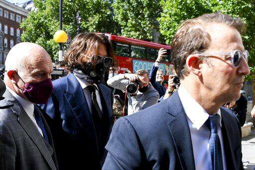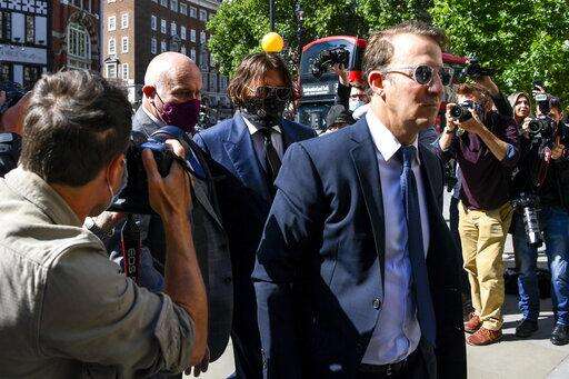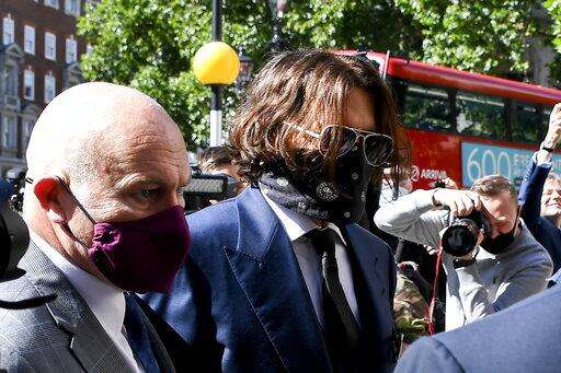Johnny Depp, right, wearing a protective mask arrives at the Royal Court of Justice, in London, Tuesday, July 7, 2020. Johnny Depp is suing a tabloid newspaper for libel over an article that branded him a "wife beater." On Tuesday, a judge at the High Court is due to begin hearing Depp's claim against The Sun's publisher, News Group Newspapers, and its executive editor, Dan Wootton, over the 2018 story alleging he was violent and abusive to then-wife Amber Heard. Depp strongly denies the claim. (Steve Parsons/PA via AP) The Associated Press