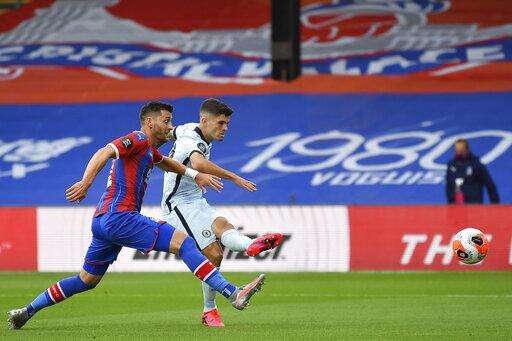 Chelsea's Christian Pulisic, right, scores his side's second goal past Crystal Palace's Joel Ward during the English Premier League soccer match between Crystal Palace and Burnley at Selhurst Park, in London, England, Tuesday, July 7, 2020. (Justin Setterfield/Pool via AP) The Associated Press
