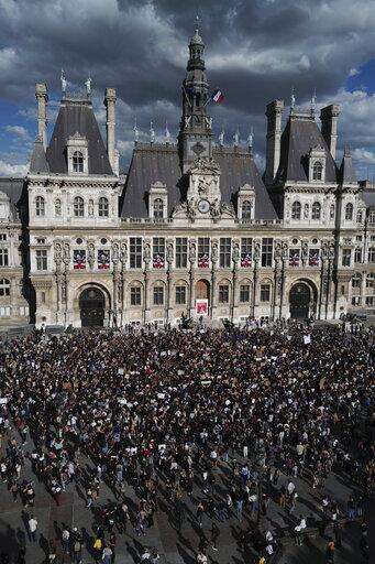 Women's rights activists protest against French President Emmanuel Macron's appointment of an interior minister who has been accused of rape and a justice minister who has criticized the #MeToo movement, in front of Paris city hall, in Paris, France, Friday, July 10, 2020. The French government said it remains committed to gender equality and defended the new ministers, stressing the presumption of innocence. Gerald Darmanin, Interior Minister, firmly denies the rape accusation, and an investigation is underway. New Justice Minister Eric Dupond-Moretti is a lawyer who has defended a government member accused of rape and sexual assault, and has ridiculed women speaking out thanks to the #MeToo movement. (AP Photo/Francois Mori) The Associated Press
