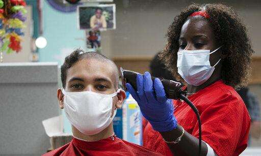 Noah Petty, of Boise, Idaho, has his hair cut by Jeanine Jennings on his first day at the U.S. Military Academy, Monday, July 13, 2020 in West Point, N.Y. The Army is welcoming more than 1,200 candidates from every state in the nation. Candidates will be COVID-19 tested immediately upon arrival, wear facial coverings, and practice social distancing. (AP Photo/Mark Lennihan)