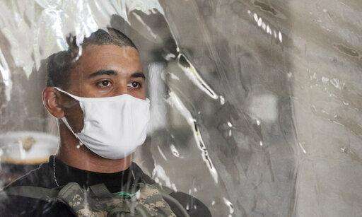 A cadet candidate stands behind a plastic screen as he gets instructions on his arrival at the U.S. Military Academy, Monday, July 13, 2020, in West Point, N.Y. The Army is welcoming more than 1,200 candidates from every state. Candidates will be COVID-19 tested immediately upon arrival, wear masks, and practice social distancing. (AP Photo/Mark Lennihan)