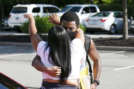 Cadet candidate Walter Thomas Pack, Jr., of Philadelphia, gets a goodbye hug from his mother Kathy as she drops him off at the U.S. Military Academy, Monday, July 13, 2020, in West Point, N.Y. The Army is welcoming more than 1,200 candidates from every state. Candidates will be COVID-19 tested immediately upon arrival, wear masks, and practice social distancing. (AP Photo/Mark Lennihan)