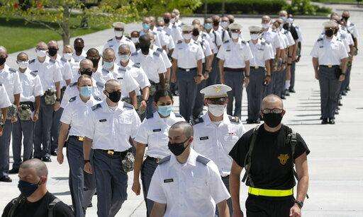 A formation of new cadets marches in formation, Monday, July 13, 2020, at the U.S. Military Academy in West Point, N.Y. The Army is welcoming more than 1,200 candidates from every state. Candidates will be COVID-19 tested immediately upon arrival, wear masks, and practice social distancing. (AP Photo/Mark Lennihan)