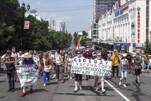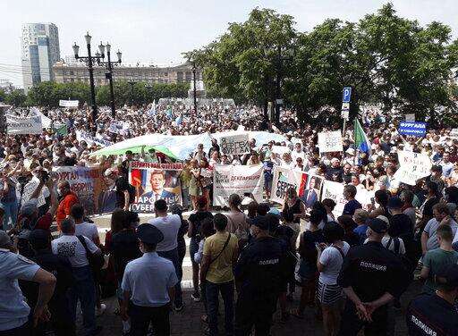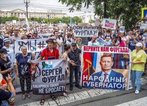 KHABAROVSK, Russia (AP) - Mass rallies challenging the Kremlin rocked Russia's Far East city of Khabarovsk again on Saturday, as tens of thousands took to the streets to protest the arrest of the region's governor on charges of involvement in multiple murders.