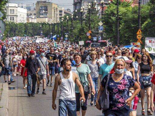 People march during an unsanctioned protest in support of Sergei Furgal, the governor of the Khabarovsk region, in Khabarovsk, 6100 kilometers (3800 miles) east of Moscow, Russia, Saturday, July 18, 2020. Tens of thousands of people in the Russian Far East city of Khabarovsk took to the streets on Saturday, protesting the arrest of the region's governor on charges of involvement in multiple murders. Local media estimated the rally in the city attracted from 15,000 to 50,000 people. (AP Photo/Igor Volkov)