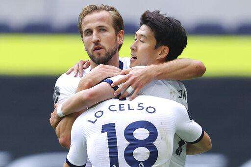Tottenham's Harry Kane, center, celebrates with Giovanni Lo Celso and Son Heung-min after scoring his side's second goal during the English Premier League soccer match between Tottenham Hotspur and Leicester City, at the Tottenham Hotspur Stadium in London, Sunday, July 19, 2020. (Richard Heathcote/Pool Photo via AP)