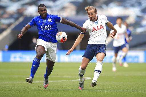 Leicester's Wes Morgan, left, and Tottenham's Harry Kane vie for the ball during the English Premier League soccer match between Tottenham Hotspur and Leicester City, at the Tottenham Hotspur Stadium in London, Sunday, July 19, 2020. (Adam Davy/Pool Photo via AP)