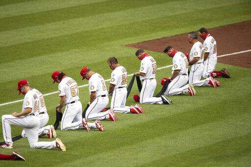 NEW YORK (AP) - The World Series champion Washington Nationals stood six feet apart along the first base line and watched as a banner commemorating their title was raised, then took a knee alongside the New York Yankees in a call for social justice.