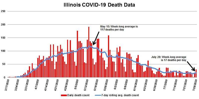Cook County reported 15 of the new deaths and DuPage County reported one. The other deaths occurred in nine downstate counties, according to the Illinois Department of Public Health.