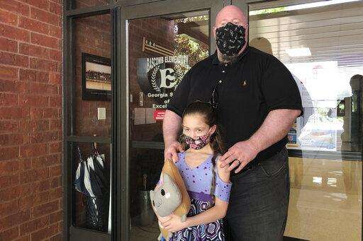 John Barrett and his daughter Autumn pose for photos outside Bascomb Elementary School in Woodstock, Ga., Thursday, July 23, 2020. Barrett says he will educate his daughter virtually and keep her out of in-person classes in Cherokee County schools, even though he's worried she will fall behind on her special education plans, because of concerns about COVID-19's spread. Cherokee County, near Atlanta, is one of many districts nationwide that gave parents a choice between in-person and all-online classes this fall. (AP Photo/Jeff Amy) The Associated Press