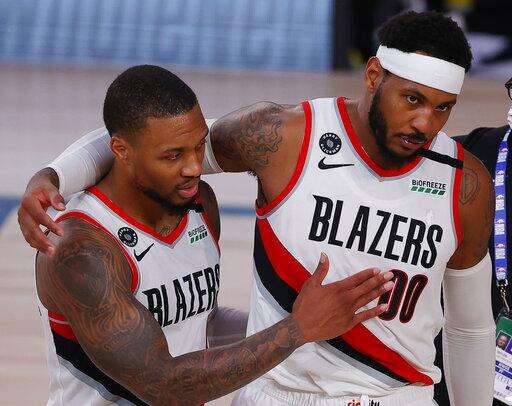 Portland Trail Blazers' Carmelo Anthony, right, and Damian Lillard celebrate the team's win over the Philadelphia 76ers in an NBA basketball game Sunday, Aug. 9, 2020, in Lake Buena Vista, Fla. (Kevin C. Cox/Pool Photo via AP) The Associated Press