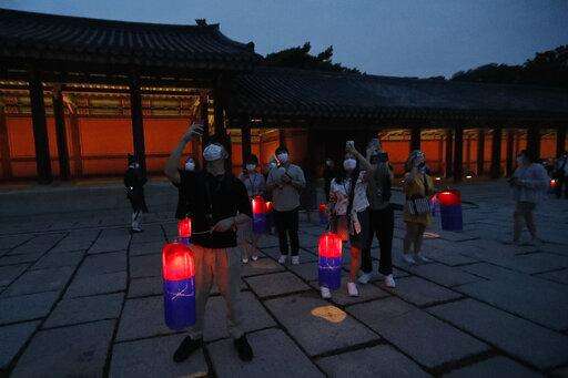 Visitors holding Korean traditional lanterns take pictures during the Moonlight Tour at Changdeokgung Palace in Seoul, South Korea, Thursday, Aug. 13, 2020. The palace reopened Thursday after having been closed for two months due to the coronavirus pandemic. (AP Photo/Ahn Young-joon)
