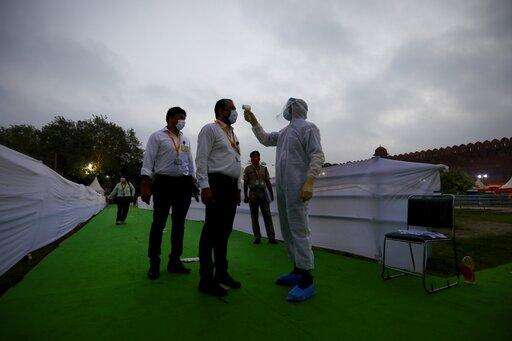 A man dressed in protective suit checks the body temperature of attendees before the start of the Independence Day ceremony on the ramparts of the landmark Red fort monument in New Delhi, India, Saturday, Aug. 15, 2020. India's coronavirus death toll overtook Britain's to become the fourth-highest in the world with another single-day record increase in cases Friday. (AP Photo/Manish Swarup) The Associated Press