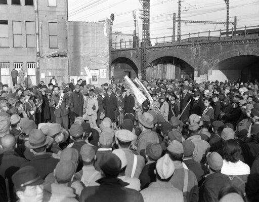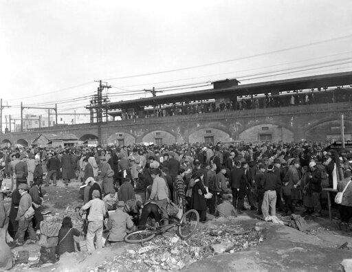 FILE - In this Dec. 16, 1945, file photo, a crowd gathers at Shimbashi railroad station in Tokyo for a hunger demonstration by residents of the city. The bombs stopped falling 75 years ago, but it is entirely possible - crucial even, some argue - to view the region's world-beating economies, its massive cultural and political reach and its bitter trade, territory and history disputes all through a single prism: Japan's aggression in the Pacific during World War II. (AP Photo/JW, File)