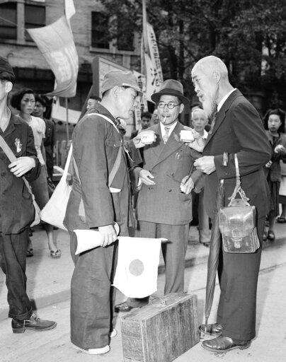 FILE - In this Oct. 7, 1949, file photo, relatives meet one of the Japanese repatriates from Manchuria and have cups of hot tea supplied by the Japanese Red Cross at the Tokyo station in Tokyo. The bombs stopped falling 75 years ago, but it is entirely possible - crucial even, some argue - to view the region's world-beating economies, its massive cultural and political reach and its bitter trade, territory and history disputes all through a single prism: Japan's aggression in the Pacific during World War II. (AP Photo, File)