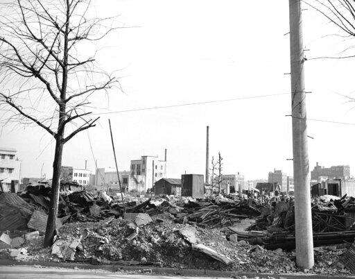 FILE - This Oct. 8, 1945, file photo shows gnarled tree branches and radio towers rearing up out of the rubble caused by bombs and fire in Tokyo during World War II. The incendiary bombs, a mixture of thermite and oxidizing agents that sometimes contained napalm, were responsible for burning over 41.5 square miles of Tokyo by the United States in March 1945. The bombs stopped falling 75 years ago, but it is entirely possible - crucial even, some argue - to view the region's world-beating economies, its massive cultural and political reach and its bitter trade, territory and history disputes all through a single prism: Japan's aggression in the Pacific during World War II. (AP Photo/Dave Davis, Pool, File)