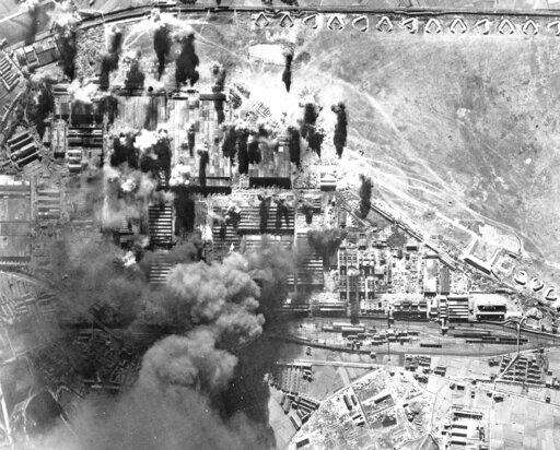 FILE - In this Jan. 19, 1945, file photo, black smoke rises from burning targets at the Kawasaki aircraft plant in Kawasaki, near Tokyo, as U.S. planes bomb the factory facilities. The bombs stopped falling 75 years ago, but it is entirely possible - crucial even, some argue - to view the region's world-beating economies, its massive cultural and political reach and its bitter trade, territory and history disputes all through a single prism: Japan's aggression in the Pacific during World War II. (AP Photo)